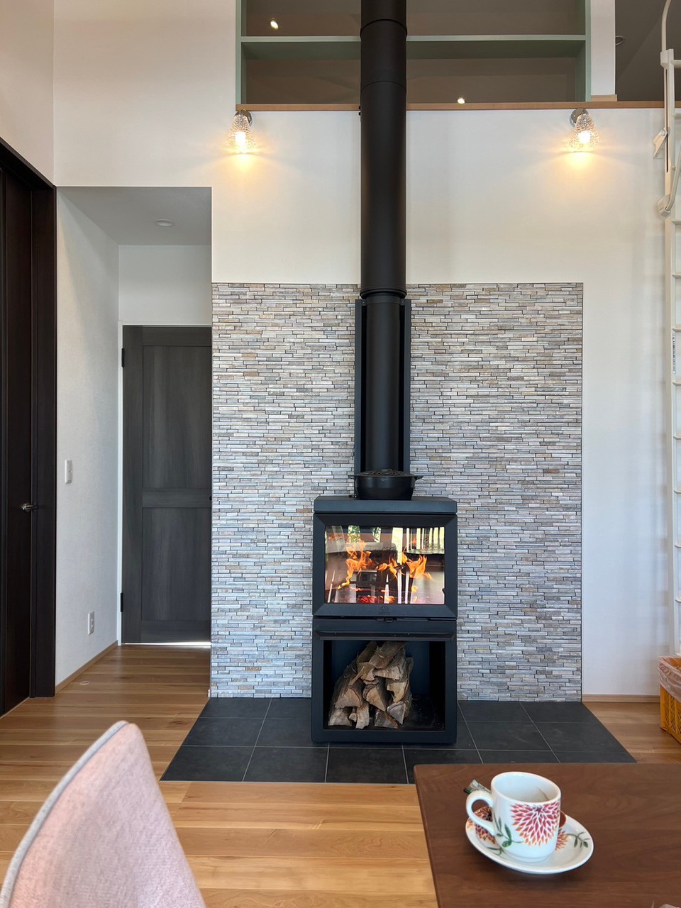 私たちがひとめぼれした重厚感あふれる薪ストーブをリビングに設置して頂き、その一角は我が家の一番お気に入りの場所となりました。