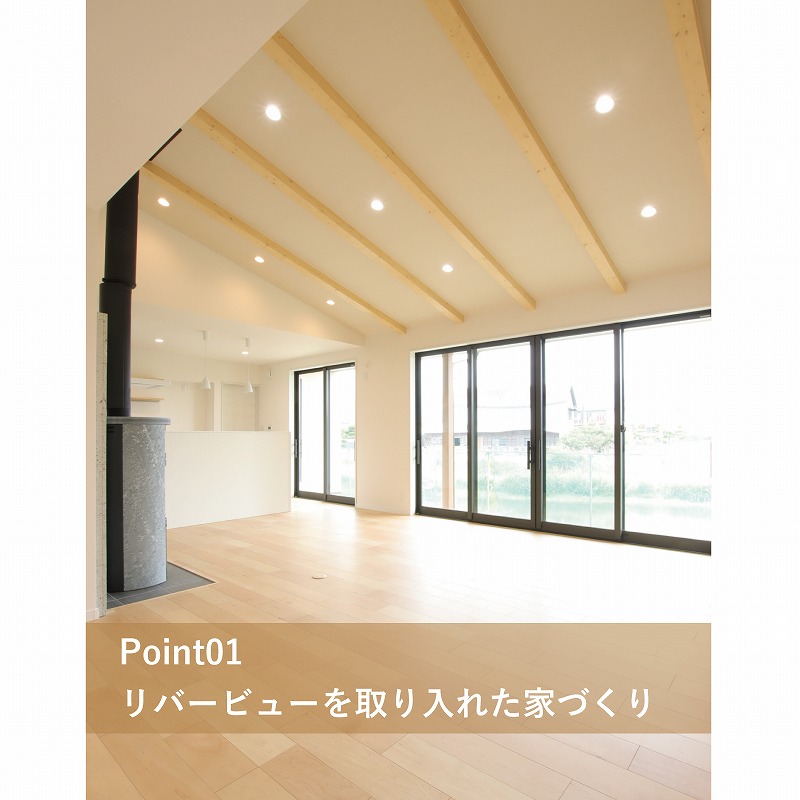 川沿いの立地を生かし、その風景をお家に取り入れました。川側に大開口の窓やウッドデッキを設け、暮らしの一部となるような設計になっています。リビングには高級感のある薪ストーブを設置し、心が豊かになるような暮らしを演出してくれます。また、将来性を考えたプランニングは、平屋をご検討される方にとって、役立つはず。