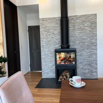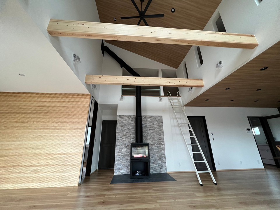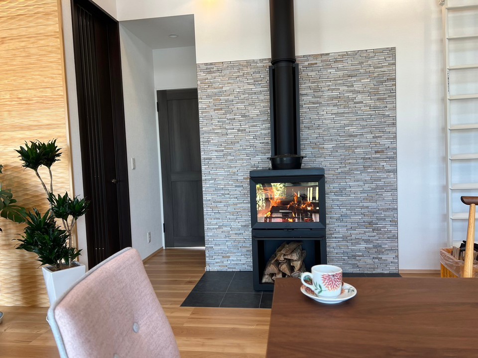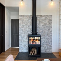 香川県 丸亀市 空間建築株式会社様 種別 薪ストーブ 機種 ヨツールF520 煙突 断熱二重煙突+シングル煙突 壁出し 炉台 / 炉壁 炉台:タイル 炉壁:石 設置のきかっけ 新築時 設計士・工務店 空間建築株式会社様 施工内容 特殊な壁出し煙突の形状となりました。三方から炎が眺められるストーブが、ショールームでお迎えします。